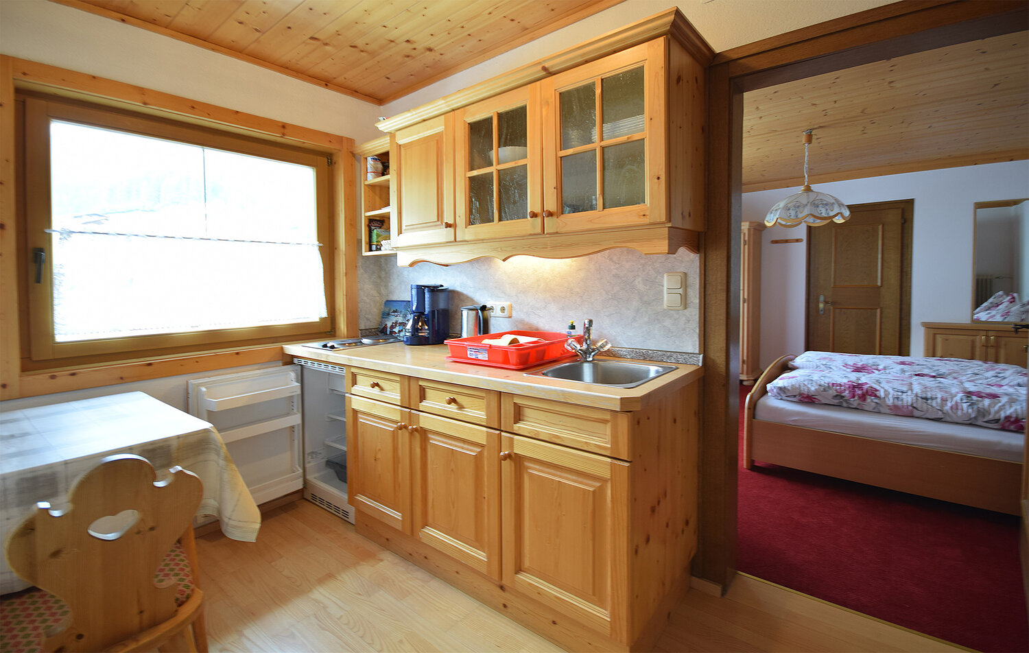 - Küche mit Grundausstattung: Geschirr, Besteck, Elektroherd, Geschirrspüler, Wasserkocher, Kaffeemaschine, Kühlschrank mit Eisfach